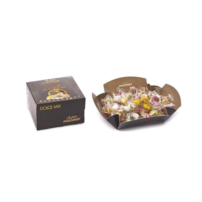 Confetti maxtris “ Dolce evento” mix da 500g incartati singolarmente .Assortimento di confetti con mandorla tostata ricoperta da cioccolato bianco assortito nei gusti amarena,orange,lemon,cocco,fragola,mela verde, da cioccolato al latte al gusto gold, da cioccolato al latte gianduia al gusto nut, da cioccolato fondente al gusto noir e da un duplice strato di cioccolato bianco e fondente al gusto classico ricoperto da un sottile strato di zucchero.