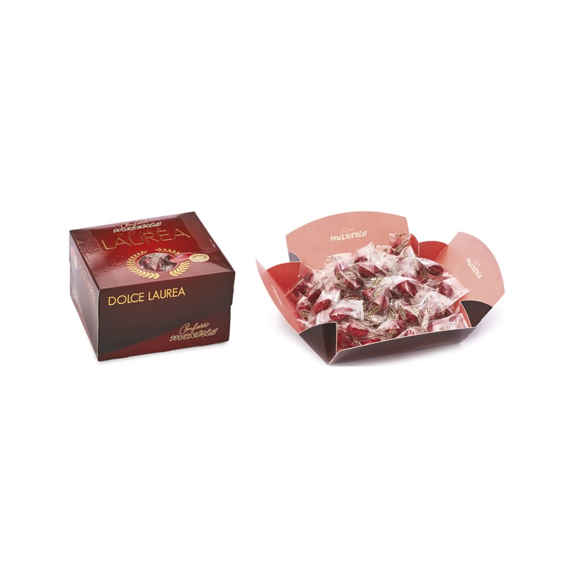 Confetti maxtris “Dolce laurea” classico rosso da 500g incartati singolarmente. Mandorla tostata avvolta da un primo strato di cioccolato fondente e da un secondo strato di cioccolato bianco, ricoperto da un sottile strato di zucchero.
